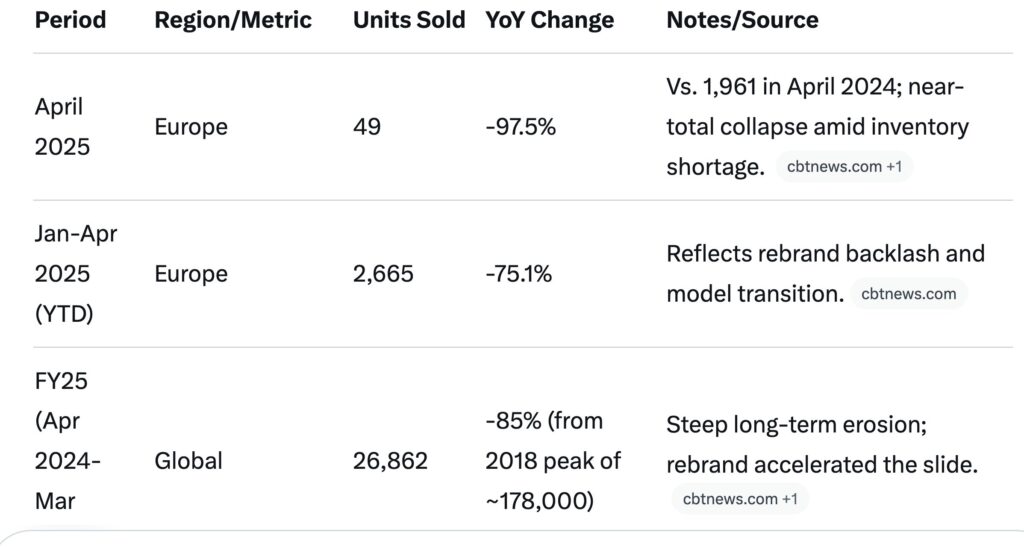 The result? A catastrophic 97.5% sales collapse, with a mere 49 vehicles sold across Europe in April. McGovern’s recent firing and unceremonious escort from the building is a fitting end to this era of self-immolation.